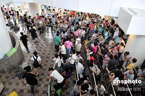 七月三十一日,中銀香港發(fā)售奧運紀念鈔票最后一天,眾多市民到各中銀分行排隊輪候購買。 中新社發(fā) 譚達明 攝