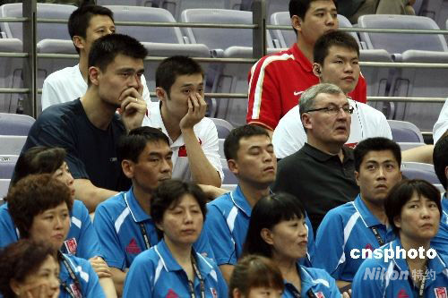 7月31日,國際籃聯(lián)2008鉆石杯男籃比賽繼續(xù)在江蘇南京進行,與中國男籃同分在一個小組的安哥拉男籃和澳大利亞隊展開對決。中國隊主教練尤納斯率姚明等球員在觀眾席上觀看比賽。中新社發(fā) 盛佳鵬 攝