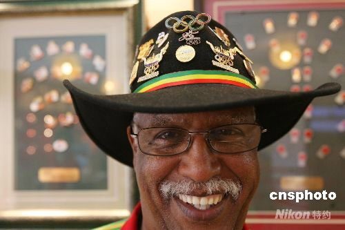7月31日,參加過(guò)十屆奧運(yùn)會(huì)的Aberra D Aguegnehu在北京奧運(yùn)村展示他的帽子和奧運(yùn)紀(jì)念章。Aberra D Aguegnehu是國(guó)際奧委會(huì)語(yǔ)言志愿者,懂十五種語(yǔ)言,能流利說(shuō)七種語(yǔ)言。