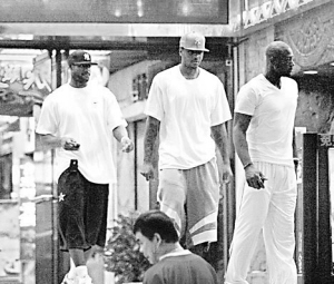 詹姆斯(左)安東尼(中)韋德(右)結(jié)伴從酒店外出。