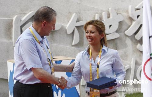 8月1日,北京奧運村啟用的“和平友誼墻”前,“給予就是獲得”公益活動正式啟動。國際奧委會主席羅格向阿拉伯聯(lián)合酋長國副總統(tǒng)兼總理、迪拜酋長穆罕默德夫人哈雅公主頒發(fā)感謝牌。中新社發(fā) 杜洋 攝