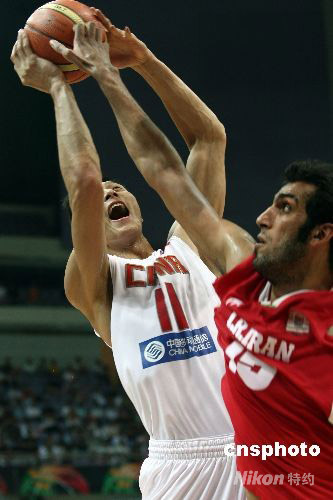 圖為中國隊11號易建聯(lián)(左)在比賽中。