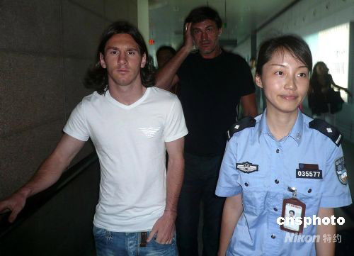 八月一日,阿根廷足球明星梅西(左),搭乘法航一一六次航班飛抵上海,在安保人員陪同下走出候機(jī)樓,與先期抵達(dá)的阿根廷國奧隊(duì)匯合,備戰(zhàn)將于八月七日開始的北京奧運(yùn)會足球上海賽區(qū)比賽。 中新社發(fā) 劉友平 攝