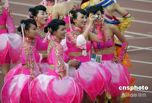 8月2日,北京奧運(yùn)會(huì)開幕式彩排在“鳥巢”進(jìn)行,身著亮麗“荷花服飾”的演員在場(chǎng)外等候入場(chǎng)時(shí),互相拍照留念。 中新社發(fā) 杜洋 攝