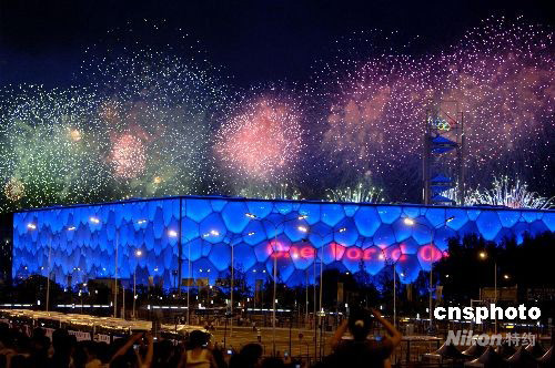 8月2日晚,北京奧運(yùn)開(kāi)幕式帶妝彩排在“鳥(niǎo)巢”舉行,圖為“水立方”上空試放焰火。 中新社發(fā) 王東明 攝