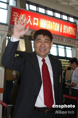 8月3日7時55分,由總領(lǐng)隊蔡賜爵等率領(lǐng)的中華臺北代表隊一行50人,搭乘華航CI603班機經(jīng)香港轉(zhuǎn)機前往北京,征戰(zhàn)2008年北京奧運會。圖為蔡賜爵在桃園機場登機入口處,他在行前向中新社記者表示,中華臺北隊此次的目標(biāo)是,最起碼要保持雅典奧運的2金2銀1銅。 中新社發(fā) 董會峰 攝