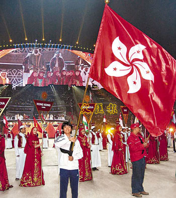 黃金寶將手持特區(qū)區(qū)旗走進(jìn)北京奧運(yùn)會(huì)。圖為多哈亞運(yùn)會(huì)。(圖片來(lái)源:文匯報(bào))