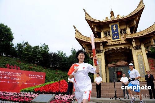 8月4日上午,北京奧運火炬開始了在四川樂山市的傳遞,這是四川省境內傳遞的第2站。首棒火炬手是兩度獲得奧運會冠軍,開創(chuàng)跳水界“高敏時代”的“跳水皇后”高敏。當日下午,奧運火炬將在綿陽九州體育館和廣漢三星堆進行展示。中新社發(fā) 廖攀 攝