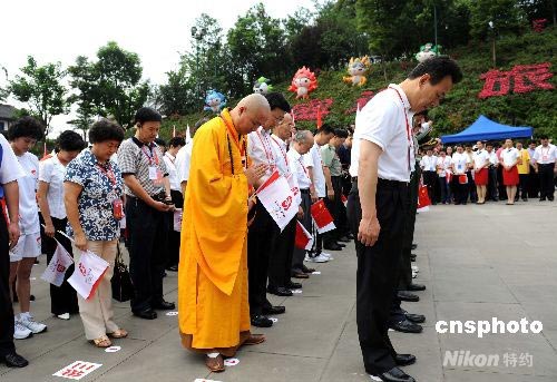 樂(lè)山起跑儀式上與會(huì)全體為地震遇難者默哀