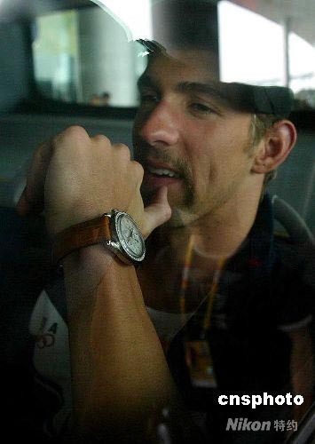 8月4日,美國(guó)游泳隊(duì)一行40余人抵達(dá)北京,開(kāi)始北京奧運(yùn)會(huì)征程,美國(guó)游泳神童菲爾普斯也隨隊(duì)抵京。 中新社發(fā) 富田 攝