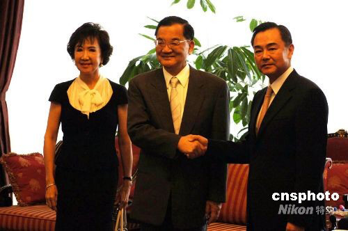 8月5日下午,中國國民黨榮譽主席連戰(zhàn)夫婦一行抵達北京首都機場,將觀禮北京奧運開幕式。圖為中共中央臺辦主任王毅在機場貴賓室會見連戰(zhàn)夫婦一行。中新社發(fā) 王東明 攝