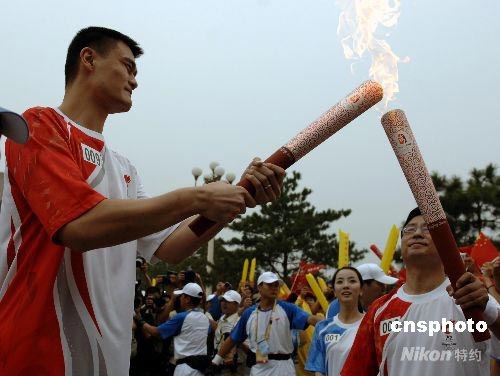 姚明傳遞第9棒火炬跑出天安門。 中新社發(fā) 王東明 攝