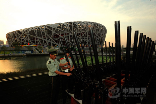 根據(jù)北京奧運會開幕式焰火施放方案,8月8日開幕式當晚,從永定門經(jīng)過天安門廣場到國家體育場“鳥巢”的15公里中軸線上,共設立35個特效焰火施放陣地。中國將首次采用新型車載式禮花炮發(fā)射禮花,開奧運禮花炮車載發(fā)射先河。圖為負責奧運開幕式禮炮發(fā)射的武警官兵預演前檢驗禮炮狀態(tài)。馮凱旋 攝
