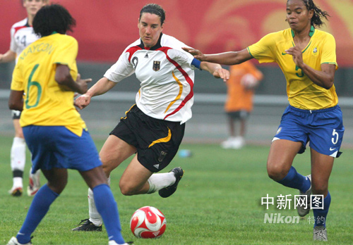 8月6日,北京奧運(yùn)會(huì)沈陽(yáng)足球分賽場(chǎng)首場(chǎng)女足預(yù)賽,巴西對(duì)德國(guó)零比零戰(zhàn)平。圖為德國(guó)隊(duì)普琳茨帶球突破。中新社記者 張宇 攝