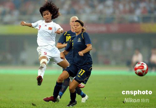 8月6日,北京奧運會女足小組賽首輪比賽全面打響,中國女足在天津奧林匹克球場迎戰(zhàn)瑞典隊。下半場第73分鐘,中國女足9號韓端大力施射破門,打入致勝一球。 中新社發(fā) 陳文 攝