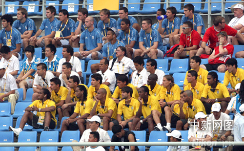 8月6日,北京奧運(yùn)會(huì)沈陽足球分賽場女足預(yù)賽,巴西對德國0:0戰(zhàn)平。圖為巴西男足隊(duì)員觀看比賽。 中新社記者 張宇 攝