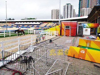 臺風(fēng)“北冕”把香港奧運(yùn)馬術(shù)沙田主場地旁的記者區(qū)裝飾物,吹得東倒西歪。(圖片來源:文匯報)