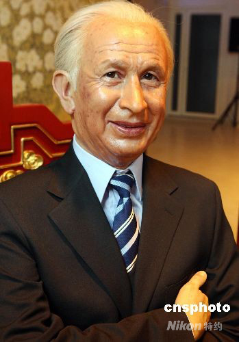 圖為國(guó)際奧林匹克博物館館長(zhǎng)加貝特觀賞中國(guó)蠟像藝術(shù)作品。