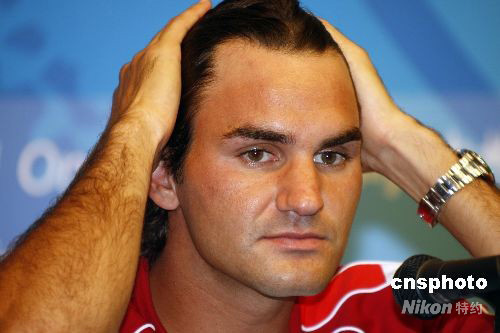 8月7日,瑞士網(wǎng)球天王羅杰·費(fèi)德勒在北京奧運(yùn)新聞中心召開(kāi)發(fā)布會(huì)。費(fèi)德勒將在8月8日開(kāi)幕式當(dāng)天度過(guò)自己27歲生日。 中新社發(fā) 杜洋 攝