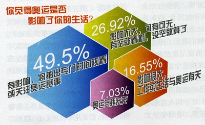 “你覺得奧運(yùn)是否影響了你的生活?”問卷調(diào)查結(jié)果顯示,66.05%的受調(diào)查者認(rèn)為有影響或影響較大。其中表示“有影響,將抽出專門時(shí)間觀看或關(guān)注奧運(yùn)賽事”的占受調(diào)查者49.5%(2228票),表示“影響很大,工作或生活與奧運(yùn)有關(guān)”的占受調(diào)查者16.55%(745票)。