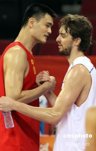 8月7日,世界冠軍西班牙男籃在北京奧運會籃球比賽館--五棵松籃球進(jìn)行賽前的最后一場熱身訓(xùn)練,效力于NBA洛杉磯湖人隊的超級球星保羅·加索爾(左)結(jié)束訓(xùn)練后與前來訓(xùn)練的中國隊超級中鋒姚明親切交談。中國與西班牙隊是同組死敵,按照實力分析中國隊擊敗世界冠軍西班牙隊的希望渺茫。 中新社發(fā) 任晨鳴