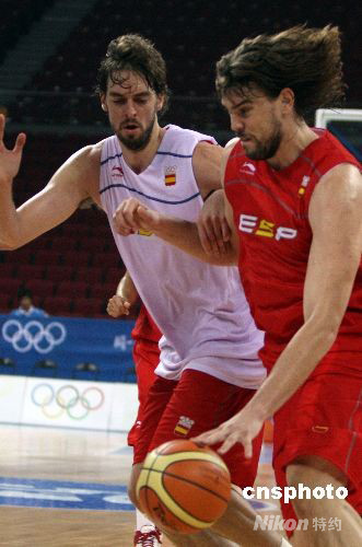 8月7日,世界冠軍西班牙男籃在北京奧運(yùn)會(huì)籃球比賽館——五棵松籃球進(jìn)行賽前的最后一場熱身訓(xùn)練,效力于NBA洛杉磯湖人隊(duì)的超級球星保羅·加索爾(左)與弟弟馬克·加索爾率領(lǐng)球隊(duì)演練戰(zhàn)術(shù)。中新社發(fā) 任晨鳴 攝