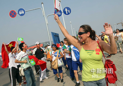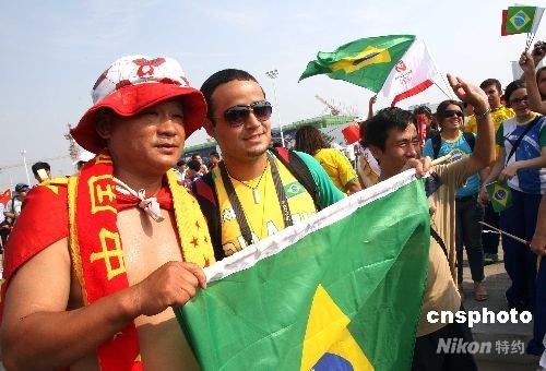 8月7日,巴西、中國球迷在北京奧運(yùn)沈陽足球分賽場歡呼。當(dāng)晚,男足巴西對比利時(shí)、中國對新西蘭將進(jìn)行小組賽。中新社發(fā) 張宇 攝