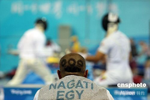 8月7日,北京國家會議中心擊劍館,一名“頭頂五環(huán)”的埃及運動員正在觀看其他運動員訓(xùn)練。 中新社發(fā) 盛佳鵬 攝