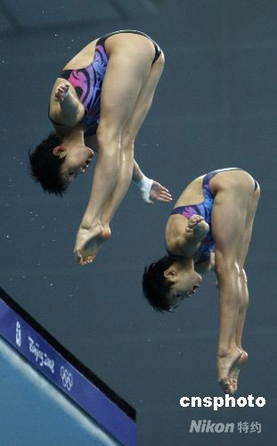 圖為女子雙人10米跳臺(tái)跳水組合陳若琳、王鑫“水立方”試水。 中新社發(fā) 杜洋 攝