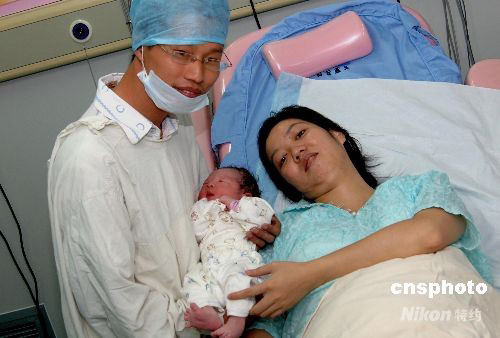 8月8日清晨5點(diǎn)30分,福州市民范敬琴在福建省第二人民醫(yī)院婦產(chǎn)科手術(shù)室順利產(chǎn)下一名奧運(yùn)男寶寶。這名奧運(yùn)男寶寶體重3.8公斤,母子平安。圖為黃義華、范敬琴夫婦與喜降人間的奧運(yùn)寶寶合影。當(dāng)天,第29屆夏季奧運(yùn)會將在北京開幕。 中新社發(fā) 劉可耕 攝