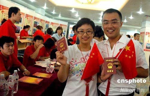北京市西城區(qū)結(jié)婚登記處迎來了一個結(jié)婚高峰日,千余新人前來領(lǐng)取結(jié)婚證書。圖為一對新人領(lǐng)到結(jié)婚證后高興合影共慶奧運。中新社發(fā) 張雙雙 攝