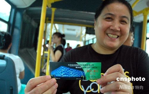 8月8日,北京奧運(yùn)會(huì)開幕日,北京公交集團(tuán)公司在所屬線路車上發(fā)售奧運(yùn)會(huì)開幕紀(jì)念公交車票。據(jù)了解,奧運(yùn)公交紀(jì)念車票分四種票樣,在不同線路車上發(fā)售,因數(shù)量有限,紀(jì)念票售完后仍出售現(xiàn)行普通票。圖為乘客高興地展示買到的奧運(yùn)紀(jì)念車票。中新社發(fā) 張雙雙 攝