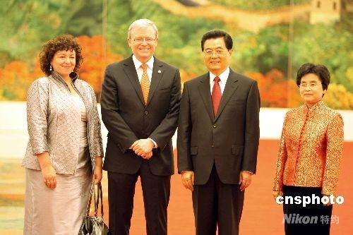 8月8日中午,中國(guó)國(guó)家主席胡錦濤和夫人劉永清在北京人民大會(huì)堂為出席北京奧運(yùn)會(huì)的貴賓舉行歡迎宴會(huì)。圖為胡錦濤夫婦歡迎陸克文夫婦。中新社發(fā) 任海霞 攝