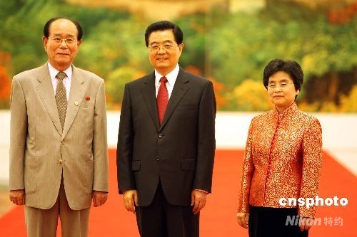 8月8日中午,中國(guó)國(guó)家主席胡錦濤和夫人劉永清在北京人民大會(huì)堂為出席北京奧運(yùn)會(huì)的貴賓舉行歡迎宴會(huì)。圖為胡錦濤夫婦歡迎朝鮮最高人民會(huì)議常任委員會(huì)委員長(zhǎng)金永南。中新社發(fā) 任海霞 攝