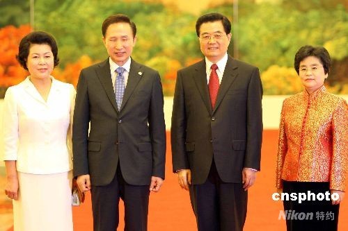 圖:胡錦濤夫婦歡迎韓國總統(tǒng)李明博夫婦