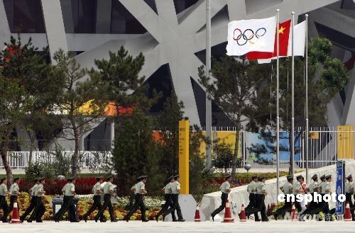 8月8日,第29屆夏季奧運(yùn)會將于當(dāng)晚在北京奧林匹克公園內(nèi)的國家體育場開幕,武警跑向“鳥巢”周邊的警戒崗位。中新社發(fā) 杜洋 攝