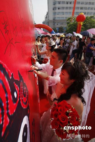 2008年8月8日,18對新人齊聚瑞安市的廣場參加集體婚禮。另外還有10對鉆石婚、金婚夫婦到場,28對愛侶在現(xiàn)場近千名群眾的祝福聲中互換信物。 中新社發(fā) 孫凜 攝