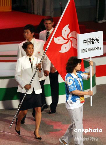 八月八日,香港特區(qū)政府在沙田賽場舉行盛大歡迎晚會(huì)上,歡迎來自世界各地參加奧運(yùn)馬術(shù)比賽的參賽隊(duì)伍。圖為香港隊(duì)入場。 中新社發(fā) 洪少葵 攝