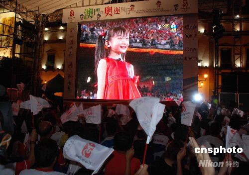八月八日晚,澳門市民在議事亭前地通過大屏幕觀看北京奧運(yùn)會開幕式,不時發(fā)出陣陣歡呼。 中新社發(fā) 畢永光 攝