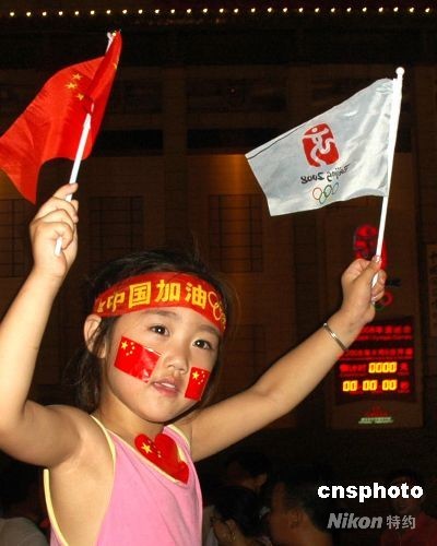8月8日晚8時,北京天安門廣場東側(cè)奧運(yùn)倒計時牌歸零。在天安門廣場為北京奧運(yùn)狂歡的一位小女孩拿著中國國旗為北京奧運(yùn)加油。中新社發(fā) 張雙雙 攝