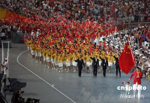 8月8日,第29屆夏季奧運(yùn)會在北京奧林匹克公園內(nèi)的國家體育場“鳥巢”舉行。中國代表團(tuán)的旗手是著名籃球運(yùn)動(dòng)員姚明,走在姚明身邊的是獲得英雄少年的光榮稱號的四川省阿壩州映秀鎮(zhèn)漁子溪小學(xué)二年級學(xué)生林浩。中國體育代表團(tuán)派出了1099人的龐大陣容,將參加全部28個(gè)大項(xiàng)的比賽。中新社發(fā) 任晨鳴 攝
