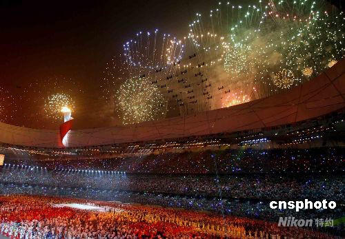 8月8日,第29屆夏季奧運(yùn)會(huì)在北京奧林匹克公園內(nèi)的國(guó)家體育場(chǎng)“鳥(niǎo)巢”舉行。李寧點(diǎn)燃北京奧運(yùn)會(huì)主火炬。在空中的“五環(huán)煙花”映襯下,奧運(yùn)圣火在鳥(niǎo)巢上空熊熊燃燒。中新社發(fā) 任晨鳴 攝