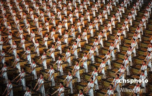 第二十九屆夏季奧運會8月8日晚在北京奧林匹克公園內的國家體育場舉行開幕式,由一千多面“戰(zhàn)鼓”組成的盛大陣容歡迎各地嘉賓。中新社發(fā) 任晨鳴 攝