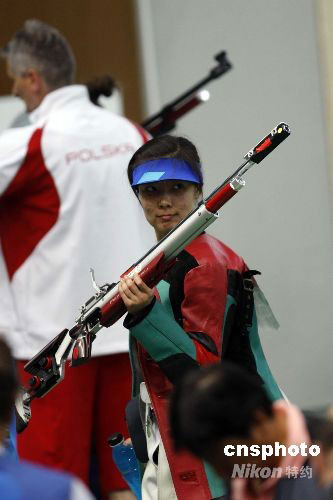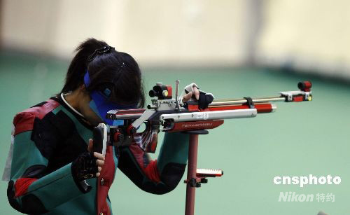 8月9日,北京奧運(yùn)會(huì)開賽的第一天,女子10米氣步槍決賽在北京射擊館進(jìn)行。中國(guó)選手杜麗無緣金牌,捷克選手卡特日娜·埃蒙斯獲得首枚金牌,同時(shí)也是北京奧運(yùn)會(huì)產(chǎn)生的首枚金牌。中新社發(fā) 盛佳鵬 攝