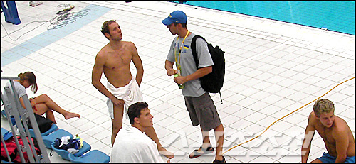 報道說,水立方的一邊是跳水場館,一邊是游泳場館,選手們的更衣室設(shè)在場館外面的走廊。外國選手尤其是歐美男子選手們經(jīng)常在賽場內(nèi)換泳褲,而且還毫不顧忌地和女隊友們邊聊邊換。當然基本程序是,用浴巾遮住主要部位,然后脫掉泳褲,再換上運動服。但是,由于這套“業(yè)務(wù)”進行得不是很精細,只能大概換一下衣服,所以偶爾會出現(xiàn)有尷尬場面,就是主要部位經(jīng)常會走光。