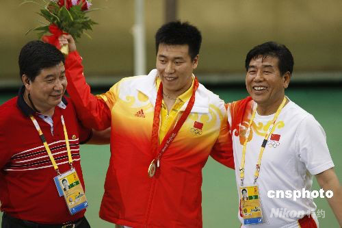 8月9日,北京奧運會射擊比賽男子10米氣手槍決賽在北京射擊館結(jié)束,中國隊22歲河北小將龐偉(中)獲得冠軍。圖為頒獎結(jié)束后,龐偉與教練王義夫(左)、陳繼元(右)合影,分享奪冠的喜悅。中新社發(fā) 盛佳鵬 攝
