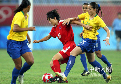 圖為朝鮮女足隊員遭巴西隊員圍搶。中新社記者 張宇 攝