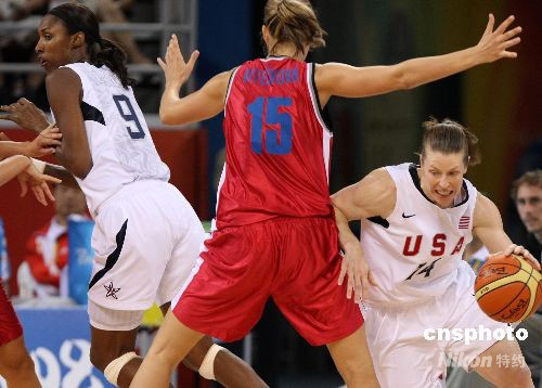 8月9日晚,雅典奧運(yùn)會(huì)冠軍美國(guó)女籃在北京奧運(yùn)會(huì)籃球館——五棵松體育館開始衛(wèi)冕之旅,首場(chǎng)比賽以97比57擊敗捷克隊(duì)。圖為美國(guó)隊(duì)超級(jí)球星9號(hào)萊斯麗,利用檔拆戰(zhàn)術(shù)協(xié)助14號(hào)后衛(wèi)史密斯突破捷克隊(duì)防線。 中新社發(fā) 任晨鳴 攝