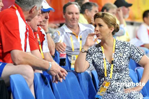 八月九日晚,北京奧運馬術項目在香港沙田賽場舉行盛裝舞步賽事,國際馬術聯(lián)合會主席、約旦公主哈雅到場觀賽,并與參賽隊伍職員在看臺上交談。中新社發(fā) 鄧慶樂 攝