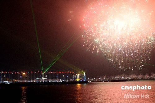 第29屆奧林匹運(yùn)動會帆船比賽啟動儀式8月9日晚在青島舉行,絢麗多彩的煙花映亮奧帆中心。中新社發(fā) 趙振清 攝